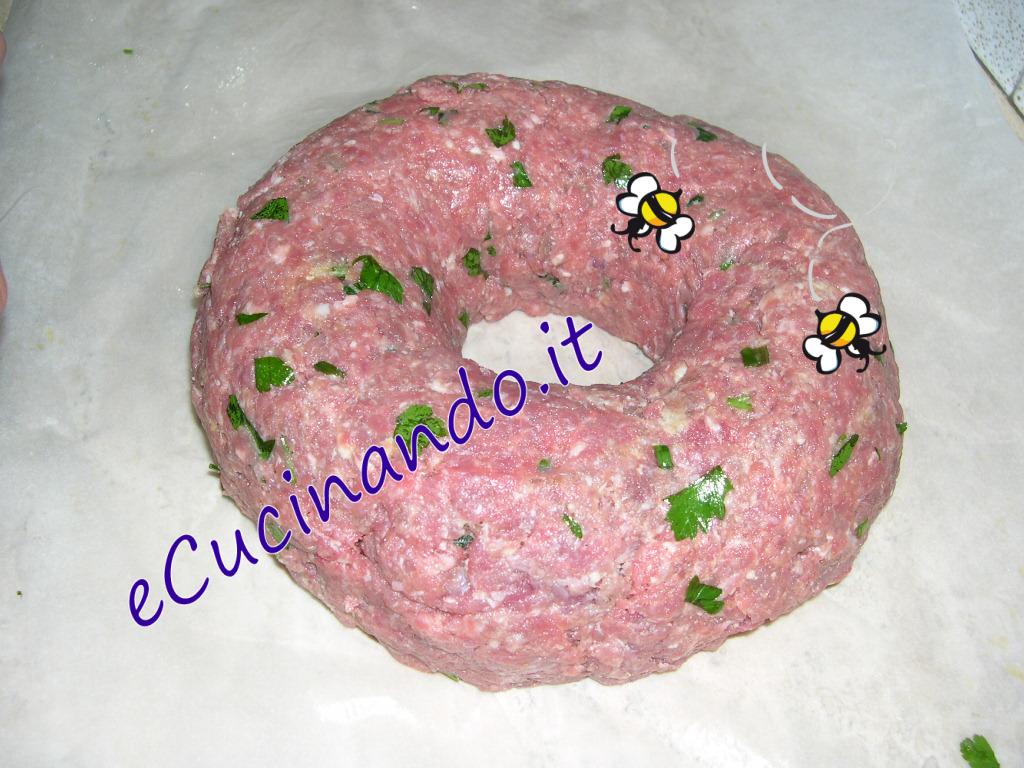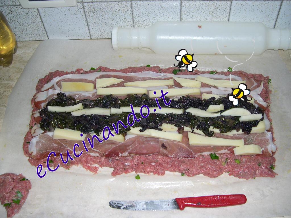 Impastare le carni come per le solite vostre polpette (uovo, parmigiano, pangrattato, latte, prezzemolo) stendere l?impasto, su carta forno ben unta di olio d'oliva, a forma di rettangolo e foderarlo con le fette di speck; aggiungere la fontina a barrette e il radicchio stufato (usare solo le foglie esterne) con un soffritto di cipolla. Chiudere il rotolo aiutandosi con la carta forno e dare al tutto la forma di grande anello curandosi di chiudere bene i lembi combacianti. Spennellare di olio d?oliva o di burro fuso e cospargere di sesamo oppure di pangrattato. Infornare per 40 minuti e comunque fino a doratura avvenuta.