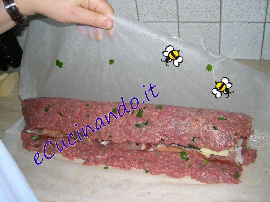 Si dispone l'impasto di carni su carta forno ben oliata e si fodera con speck in modo molto uniforme, formaggio a bastoncini ...