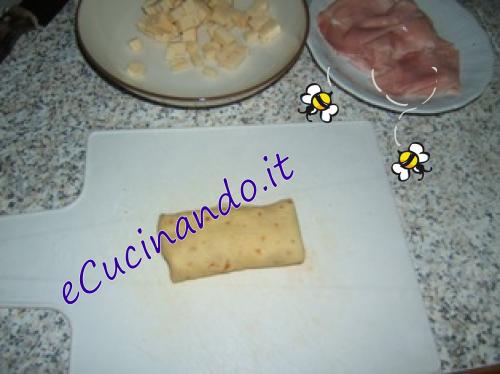 Mettere su ogni crèpe una fettina di prosciutto e alcuni cubetti di fontina,
