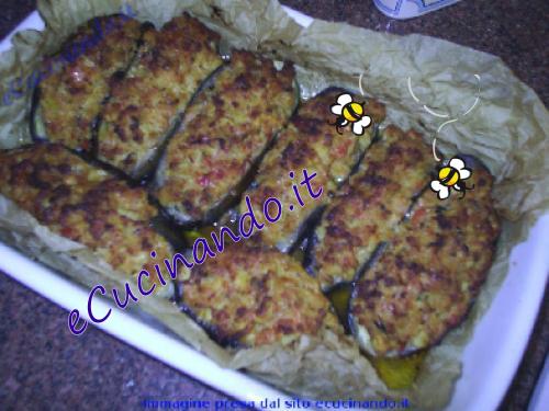 Tagliare a metà le melanzane, svuotarle lasciando mezzo centimetro di margine e sbollentare i gusci in acqua salata per 5 minuti. Tagliare la polpa a dadini piccoli e trifolarla con olio, prezzemolo ed aglio. Lasciare raffreddare ed aggiungere il resto degli ingredienti. Per non perdere tempo con la mezzaluna e per ottenere una farcia omogenea nel sapore ho passato nel robot i pomodori secchi, il Dolce Sardo e le uova. La farcia deve essere morbida, se non lo fosse, aggiungere ancora uova oppure qualche cucchiaio di acqua. Riempire i gusci e passare in forno